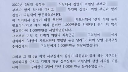 여기에 김 의원이 부인의 업무추진비 유용 의혹 수사를 무마해달라고 청탁했다는 주장까지 나오며 '봐주기 수사' 의혹은 더욱 커졌습니다.