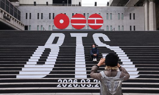 6일 서울 종로구 세종문화회관 계단에 방탄소년단(BTS)의 정규 5집 로고와 발매 일자, 팀명을 이용한 래핑이 되어 있다. 멤버들의 군 전역 후 ‘완전체’로 돌아오는 BTS의 정규 5집은 3월20일 발매된다. 남정탁 기자 ⓒ 세상을 보는 눈, 세계일보