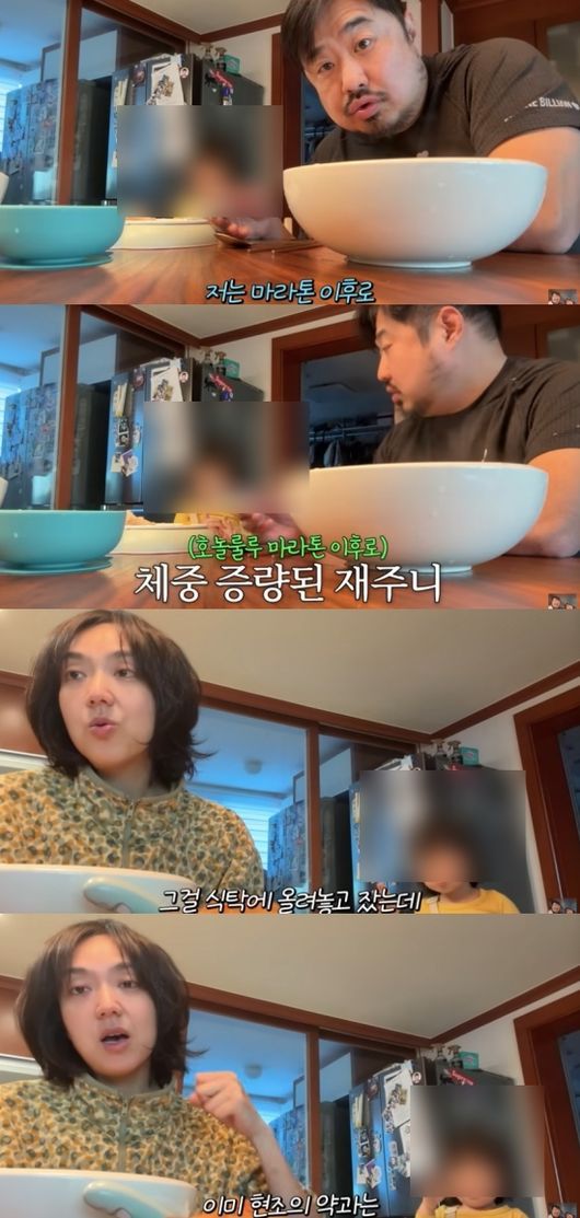 이날 이은형, 강재준, 아들은 새해를 맞아 떡국을 먹었다. 강재준은 아들과 나란히 앉아 식사를 했다. 강재준은 “마라톤 이후로 발목이 아파 뛰질 못했다. 맨날 먹기만 해서 살이 쪘다. 5kg이 쪘다”라고 고백했다.