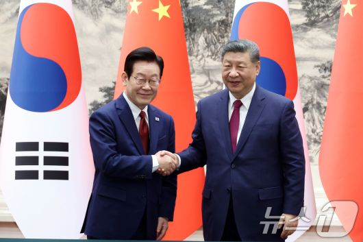 이재명 대통령과 시진핑 중국 국가주석이 지난 5일 베이징 인민대회당에서 열린 한중 MOU 체결식에서 악수하고 있다.2026.1.5/뉴스1 ⓒ News1 허경 기자 |