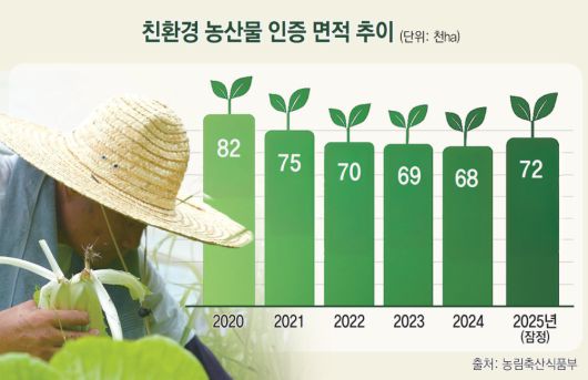 그러나 실제로 친환경 농업 인증 면적은 줄어드는 추세다. 2020년 8만1827ha에 달했던 친환경 인증 면적은 2024년 6만8165ha로 약 17% 감소했다. 기후변화로 병충해가 늘고 고령화로 노동력이 부족해지고 물가 상승으로 생산비는 치솟는데 판로는 좁아지면서 농가들이 하나둘 친환경 농업을 포기하고 있는 것이다.”