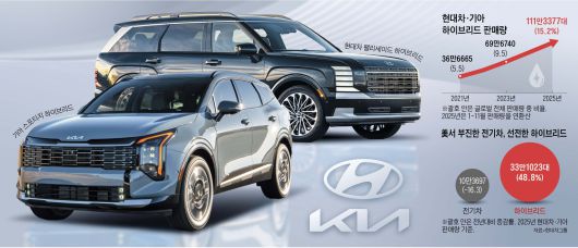 현대차그룹은 미 관세 장벽, 내수 침체, 전기차 캐즘(일시적 수요 정체)이라는 3중 악재를 딛고 지난해 글로벌 판매량(727만대)을 전년보다 오히려 0.6% 늘렸다. 하이브리드 판매량이 약 23% 늘며 선전한 게 결정적이었다. 하이브리드는 친환경차를 원하는 소비자들 사이에서, 충전 불편 문제가 여전한 전기차의 대안으로 주목받고 있다.