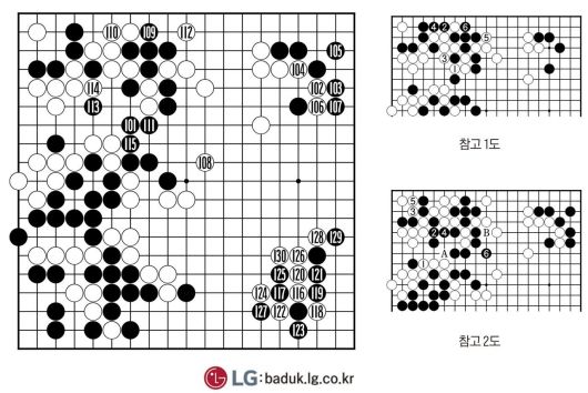 108은 대마 사활에 마지막 질문을 던진 유일하게 남은 승부처. 백 두 점이 장문에 걸린 형태지만 흑 대마가 완생은 아니다. 114로 참고 2도 1로 받는 것은 6 다음 A, B가 맞보기로 흑이 살게 된다. 116은 팻감 공작. 117~130은 정석형이다.