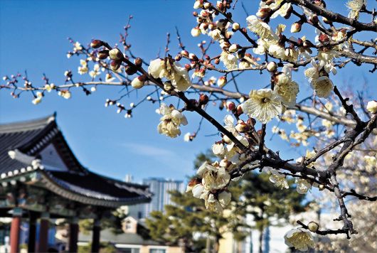 연합뉴스“봄 아니었어?” 활짝 핀 매화꽃 6일 강원도 강릉시 용강동에 있는 대도호부 관아(중앙 관리들이 머물던 곳)에 봄꽃인 매화가 펴 있는 모습. 이날 강릉의 낮 최고 기온은 8도를 기록했다. |
