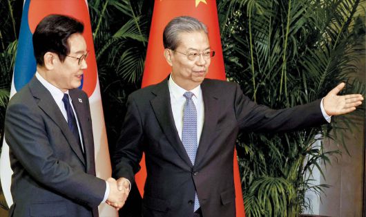 뉴스1자오러지 위원장 “이쪽으로…” 중국을 국빈 방문 중인 이재명 대통령이 6일 베이징 인민대회당에서 중국 서열 3위인 자오러지 전국인민대표대회 상무위원장과 기념 촬영을 한 뒤 자리를 안내받고 있다. 이 대통령은 “한중 관계를 더욱 발전시킬 수 있게 전인대의 지지와 성원을 부탁드린다”고 했다. |