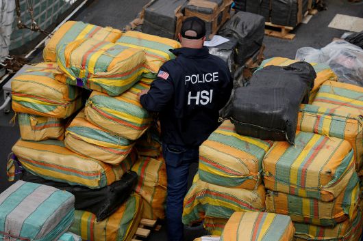 2022년 2월 미국 해안경비대 소속 법 집행관이 압수된 약 24t 상당의 코카인과 7t 규모 마리화나를 지켜보고 있다. /로이터 연합뉴스 |