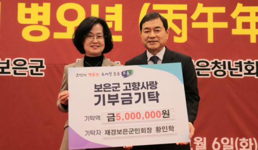 [보은=뉴시스] 보은청년회의소가 6일 충북 보은군 보은읍 그랜드컨벤션에서 개최한 2026 신년인사회에서 재경보은군민회 황인학(오른쪽) 회장이 고향사랑기부금 500만원을 변인순 보은군수에게 전달하고 있다. 황 회장은 2023년부터 4년 연속 500만원씩 총 2000만원을 고향사랑기부금으로 기탁했다. (사진=보은군 제공) |