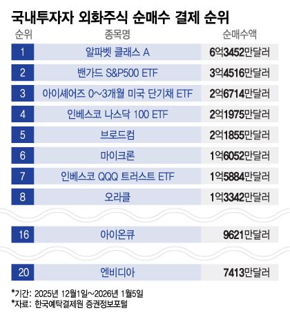 한편 지난달 1일부터 이달 5일까지 S&P500지수를 추종하는 ETF(상장지수펀드)인 '뱅가드 S&P500'이 3억4516만달러(약 5000억원)의 순매수를 기록하며 알파벳 클래스A 뒤를 이었다. 이밖에도 3개월 미만 초단기 미국 국채에 투자해 단기 파킹용 상품으로 활용되는 블랙록자산운용의 '아이셰어즈 0~3개월 미국 단기채 ETF'와 나스닥100지수를 추종하는 '인베스코 나스닥100 ETF'가 순매수 상위에 올랐다. 반도체 슈퍼사이클에 대한 기대감을 반영하듯 브로드컴, 마이크론, 오라클 등 AI·반도체 관련 기업도 국내 투자자 순매수 상위 10개 종목에 들었다.