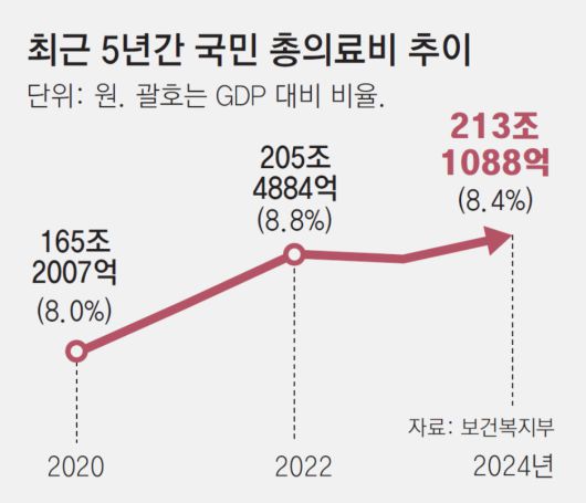 2024년 GDP 대비 의료비 비율은 8.4%로 집계됐다. 고령화와 의료 접근성 향상으로 이 비율은 2004년(4.4%) 이후 2022년 8.8%까지 지속적으로 증가했다. 다만 2020∼2022년은 신종 코로나바이러스 감염증(코로나19) 유행으로 의료 지출이 급증한 시기였다. 팬데믹이 끝난 2023년 GDP 대비 의료비 비율은 8.5%로 줄었고, 2024년엔 의정 갈등 여파로 의료 이용이 감소하면서 2년 연속 낮아졌다.