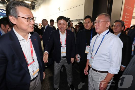 (라스베이거스=뉴스1) 황기선 기자 = 정의선 현대자동차 회장이 6일(현지시간) 미국 네바다주 라스베이거스 컨벤션센터(LVCC)에서 열린 'CES 2026'에서 LG전자 부스를 찾아 류재철 사장과 대화를 하고 있다. 2026.1.7/뉴스1