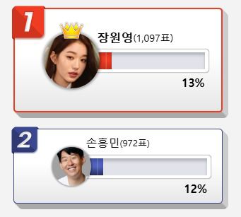 총투표수 8761표 중 1097(13%)표로 1위에 오른 장원영은 걸그룹 아이브의 멤버로 흘러넘치는 끼와 재능으로 천상 아이돌로 불리고 있다.