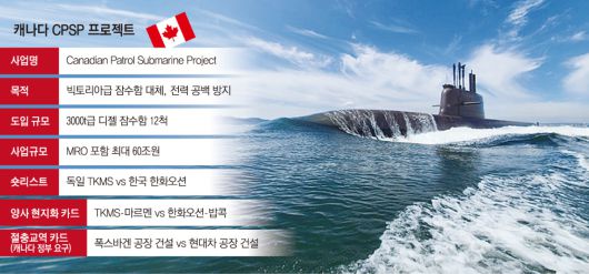 캐나다 정부는 3월 2일까지 최종 제안서 제출받아 올 상반기 중 우선협상대상자를 선정할 예정이다. 업계 관계자는 “8조 원 규모 폴란드 신형 잠수함 도입 사업에서도 한화오션이 스웨덴에 밀려 막판에 고배를 마신 것처럼 이제는 단순히 무기 성능, 납기만으로는 경쟁이 어렵다”면서 “정무적 판단이 개입될 수밖에 없어 정부의 지원이 어쩔 수 없이 필요한 상황”이라고 말했다.