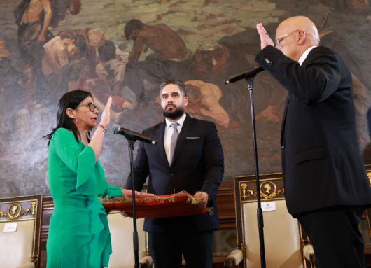 로드리게스 임시 대통령은 “조국에 대한 불법적인 군사적 침략으로 인해 베네수엘라 국민이 겪은 고통에 대한 슬픔을 안고 이 자리에 왔다”고 말했다. 그는 이날 마약 테러 공모 등 범죄 혐의의 피고인으로 미국 뉴욕 법정에 선 마두로를 ‘대통령’이라고 칭하며 “미국에 억류된 우리의 영웅들, 마두로 대통령과 영부인 실리아 플로레스의 피랍에 깊은 고통을 느낀다”고 말했다. 그러면서 “국민의 정신적 안정, 경제·사회적 안정을 보장하겠다”고 맹세했다.