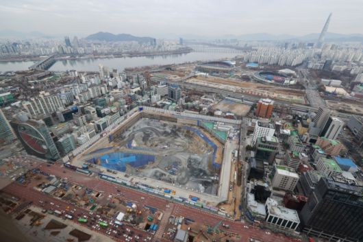 6일 오후 서울 강남구 트레이드타워에서 바라본 현대자동차그룹의 글로벌비즈니스콤플렉스(GBC) 사업 부지. 서울시와 현대차그룹이 GBC 사업 재추진을 확정함에 따라 옛 한국전력 부지에 49층 타워(약 242m 높이) 3개 동이 조성된다. 뉴스1 |