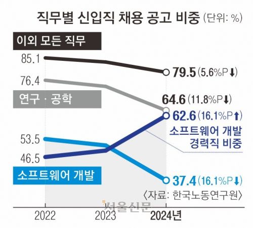 실제로도 소프트웨어 개발자 채용 공고에서 신입 개발자 비중은 2년 새 대폭 축소됐다. 6일 한국노동연구원이 지난달 발행한 ‘최근 소프트웨어 개발자 수 및 직무 변화’ 보고서에 따르면 소프트웨어 개발직 채용 공고에서 신입이 차지한 비중은 2022년 53.5%에서 2024년 37.4%로 2년 새 16.1% 포인트 급감했다. 채용시장 한파로 같은 기간 11.8% 포인트 감소한 연구·공학 분야와 5.6% 포인트 감소한 다른 모든 직무와 비교해도 내림 폭이 컸다.