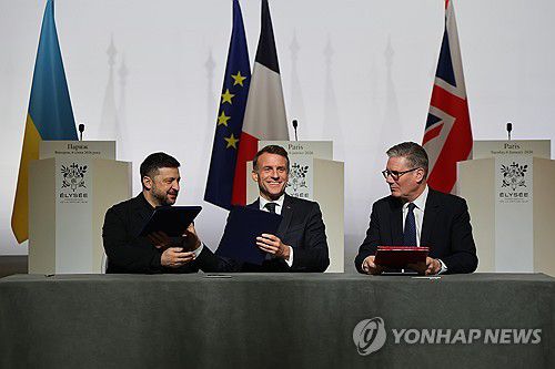 (파리=연합뉴스) 송진원 특파원 = 영국과 프랑스, 우크라이나 정상이 휴전 후 우크라이나에 다국적군을 배치한다는 내용의 의향서에 서명했다.