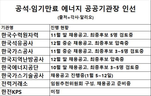 가스공사와 한국지역난방공사(071320)(한난)처럼 현 사장의 3년 법적 임기가 끝난 곳에 대한 후임 인선에도 속도가 나고 있다. 두 곳 모두 지난해 말 채용공고를 내고 후보군을 압축하는 작업을 진행 중이다.