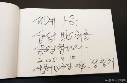 (서울=뉴스1) 국회사진기자단 = 정청래 더불어민주당 대표가 10일 경기 평택시 삼성전자 팽택캠퍼스를 찾아 반도체 산업 발전을 위한 현장 간담회를 가졌다. 사진은 정 대표가 작성한 방명록. 2025.9.10/뉴스1 Copyright (C) 뉴스1. All rights reserved. 무단 전재 및 재배포, AI학습 이용 금지. /사진=(서울=뉴스1) 국회사진기자단 |