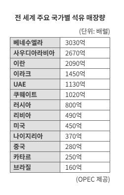 석유수출국기구(OPEC)에 따르면 베네수엘라는 전 세계 매장량의 약 5분의 1에 해당하는 3030억 배럴의 석유를 보유하고 있다. 하지만 미국 제재와 투자 부족, 국영 석유회사의 경영 부실 탓에 하루 평균 석유 생산량은 약 92만배럴에 그쳤다. 이는 전 세계 생산량의 0.8%에 불과한 수준이다.