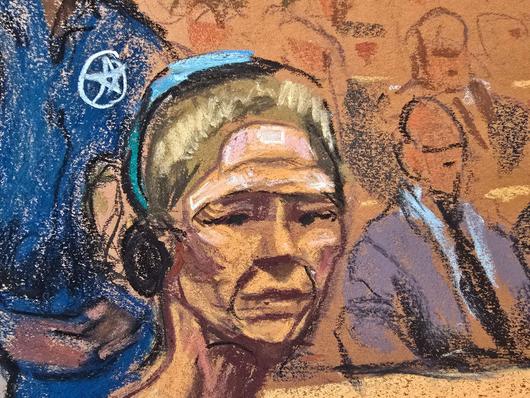 5일 미국 뉴욕에서 열린 재판에서 이마에 붕대를 붙이고 나온 실비아 플로레스./AFP 연합뉴스 |