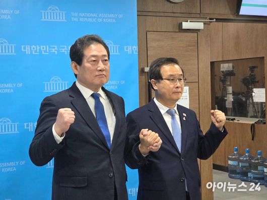 더불어민주당 최고위원 후보를 사퇴한 유동철 부산 수영구 지역위원장과 이건태 후보가 6일 소통관에서 손을 잡고 포즈를 취하고 있다. [사진=라창현 기자] |
