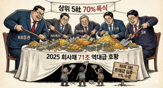 2025년 회사채 시장은 사상 최대 호황을 누렸으나, 그 온기는 상위권의 전유물이었다. 독과점 구조가 공고해지는 가운데, 자본력 경쟁에서 밀린 하위권 증권사들이 독자적인 생존 모델을 찾지 못할 경우 시장에서 완전히 퇴출당할 수 있다는 위기감이 고조되고 있다.