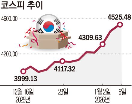 코스피 지수가 4500선을 넘어 연초부터 연일 사상 최고치를 경신하고 있지만 시장에서는 “지수는 뜨겁고 구조는 불안하다”는 우려가 동시에 나온다. 외국인 자금이 열어 놓은 상승 흐름을 개인 투자자가 이어받고 있는 현재 장세가 과연 얼마나 버틸 수 있느냐가 핵심 쟁점으로 떠올랐다. 증시 전문가들도 잠시 숨 고르기에 들어갔지만 여전히 수급의 키는 외국인이 쥐고 있다고 분석했다.