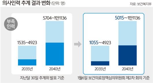 그러나 이날 보정심에 보고된 의사 부족 수는 2035년 1055~4923명, 2040년 5015~1만1136명이었다. 2035년 기준 하한선이 480명, 2040년은 689명이 감소했다. 이는 의사인력의 공급량 부문에서 일부 변수를 미세조정하면서 기존 추계보다 의사 공급 수가 늘어난 것이다. 복지부 관계자는 “의사 면허를 취득한 인력 중 실제 임상 활동을 하는 비율이 95%에서 96.01%로 상향 조정된 데 따른 것이다. 추계위 마지막 회의에서도 이런 의견이 제시됐고, 보정심에 보고할 때 추가 보완을 한 것”이라고 설명했다. 의사들의 은퇴나 사망 등 현장 이탈 정도가 기존 추계보다 적게 집계된 셈이다.