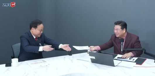 구독자 약 133만명을 보유한 극우 성향 유튜버 고성국씨(오른쪽)가 지난 5일 생방송 중 방송에 출연한 국민의힘 김재원 최고위원에게 입당원서를 제출하고 있다. 유튜브 ‘고성국TV’ 영상 캡처 |