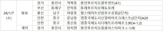 부동산 정보업체 부동산R114에 따르면 7일 오늘은 경기 용인시 '용인푸르지오클루센트(A1)', 부산 동래구 '동래푸르지오에듀포레', 울산 남구 '힐스테이트선암호수공원(2단지)', 인천 중구 '영종국제도시신일비아프크레스트(2단지)A20', '영종국제도시디에트르라메르Ⅰ(RC4-1,2)' 등 단지에서 당첨자를 발표한다.