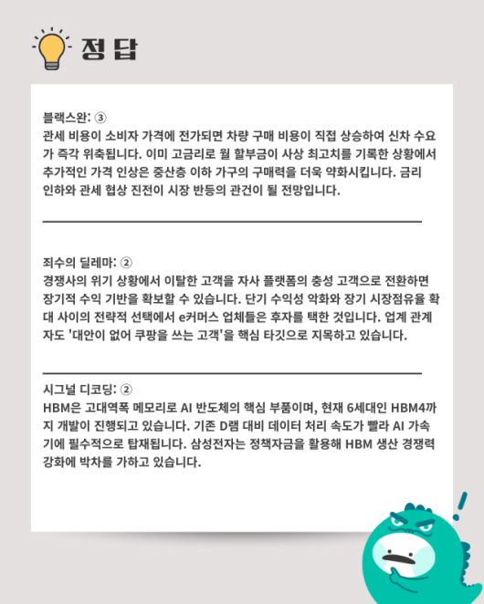 ■ 이커머스 멤버십 전쟁: 쿠팡 와우 멤버십 가격 인상을 계기로 경쟁사들이 일제히 반격에 나섰다. SSG닷컴은 월 2900원에 7% 적립률을 제공하는 신규 멤버십을 출시했고, 네이버는 무료배송 기준을 4만 원으로 낮추는 등 셀러 유치 경쟁이 격화되고 있다.