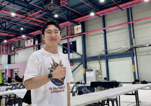 김재현 랫택 대표가 삼단봉 테스트 콘텐츠 촬영을 위해 보호장구를 착용한 모습. 카페24 제공 |