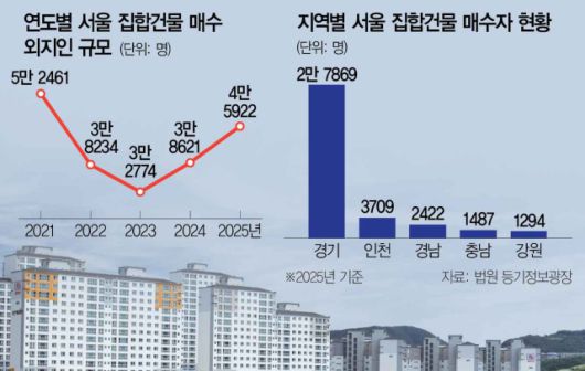 6일 법원 등기정보광장에 따르면 지난해 서울 집합건물(아파트·빌라·오피스텔 등)을 매수한 외지인은 4만 5922명으로 전년 대비 18.9% 증가했다. 이는 집값 급등기였던 2021년(5만 2461명) 이후 최대 규모이다. 외지인 숫자는 △2022년 3만 8234명 △2023년 3만 2774명 △2024년 3만 8621명으로 3만 명 대를 유지하다가 지난해 4만 명을 넘어섰다. 지난해 외지인 비중은 25.1%로, 매수자 4명 중 1명이 외지인이었다.