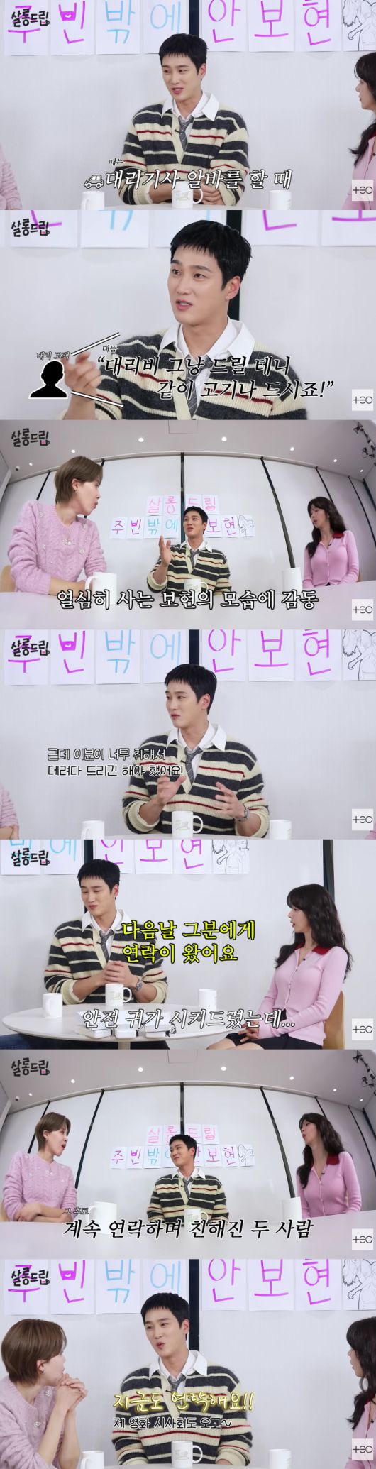 이날 안보현은 대리기사로 일하던 당시를 떠올리며 특별한 인연을 소개했다. 그는 "대리를 불렀는데 나오지 않아서 술집을 직접 찾아갔다. 그분이 '내가 대리비를 낼 테니 같이 앉아서 고기를 먹자'고 하더라"며 "그분이 날 보고 충격을 받은 거다. 이렇게 열심히 사는 사람이 있구나 싶어서. 나는 땡잡았다고 생각했다"라고 말했다.