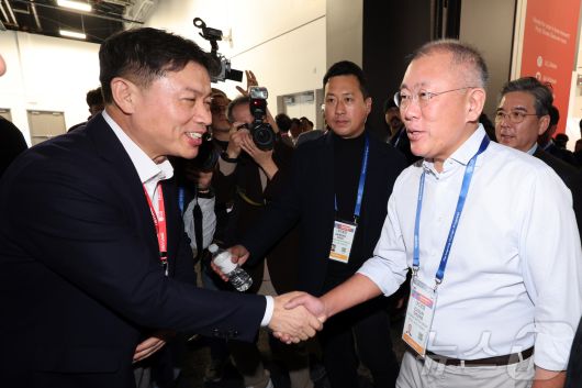 정의선 현대자동차 회장이 6일(현지시간) 미국 네바다주 라스베이거스 컨벤션센터(LVCC)에서 열린 'CES 2026'에서 LG전자 부스를 찾아 류재철 사장과 악수를 하고 있다. 2026.1.7/뉴스1 ⓒ News1 황기선 기자 |