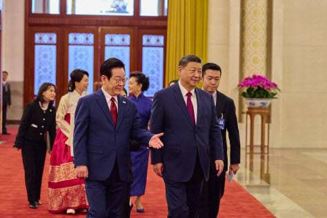 이재명 대통령과 시진핑 중국 국가주석이 5일 베이징 인민대회당에서 열린 이 대통령 공식환영식 후 정상회담을 위해 이동하고 있다. (사진=연합뉴스) |