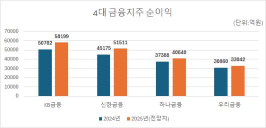 7일 금융정보업체 에프앤가이드에 따르면 KB·신한·하나·우리 등 4대 금융지주의 2025년 당기순이익(지배주주 순이익 기준) 컨세서스는 18조3592억원으로 전년(16조4205억원) 대비 11.8% 증가할 것으로 예상됐다.