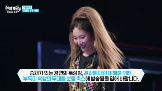 숙행은 강혜연의 상대로 지목된 후 나란히 무대에 오르는 모습에 얼굴을 비췄다. 제작진은 '승패가 있는 경연 특성상, 결과에 대한 이해를 위해 부득이 숙행의 무대를 분량 축소해 방송됨을 양해 바랍니다'라는 자막을 띄웠다.