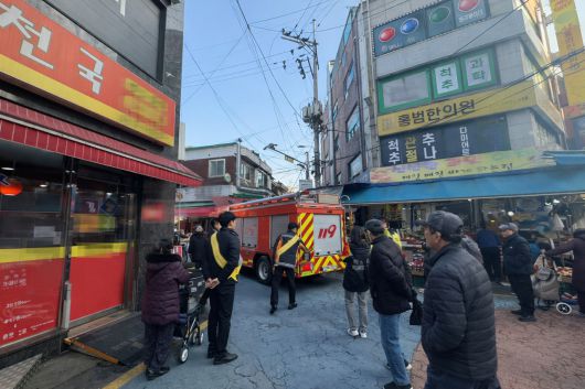 시장 골목길에 소방차가 정차해 있고, 소방관과 사람들이 주변에 모여 있는 사진이다. 주변 상점에는 간판이 달려 있고, 전선이 복잡하게 연결되어 있다. |