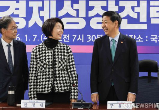 [서울=뉴스핌] 윤창빈 기자 = 한정애 더불어민주당 정책위의장, 구윤철 부총리 겸 기획재정부 장관이 7일 서울 여의도 국회 의원회관에서 열린 2026년 경제성장전략 당정협의에서 대화를 나누고 있다. 2026.01.07 pangbin@newspim.com