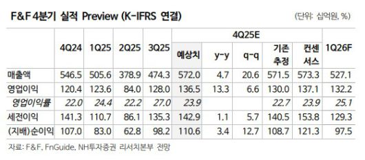 정 연구원은 F&F가 지난해 4분기 연결 기준 매출액 5720억 원, 영업이익 1365억 원을 기록할 것으로 전망했다. 전년 동기 대비 각각 5%, 13% 증가하며 컨센서스에 부합할 것으로 봤다.