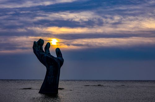 김승국 조각가의 이 작품에 대해 바닷속 손과 육지 손 사이에 있는 안내문은 이렇게 설명하고 있다.