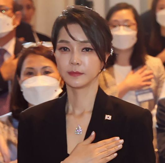 2022년 6월 29일(현지시간) 스페인 마드리드 만다린 오리엔탈 리츠호텔에서 열린 동포 만찬간담회에서 국민의례를 하는 김건희 여사가 반클리프 목걸이를 착용하고 있다. 연합뉴스 |