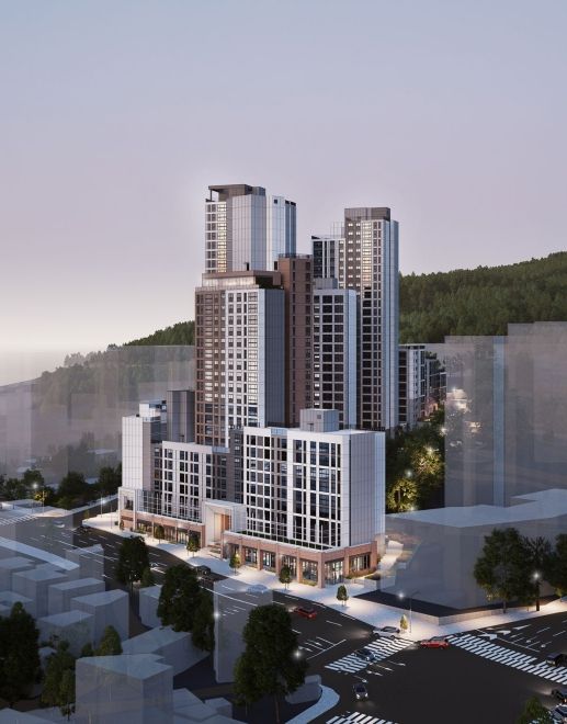 551세대 주택공급이 본격화되는 용마터널 인근 복합사업 조감도 사진이다. 지하 6층에서 지상 28층 규모의 건물은 여러 동으로 구성되어 있고, 건물 주변에는 도로와 주택이 위치해 있다. |