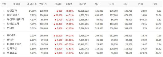 7일 네이버페이증권에 따르면 검색상위 종목은 삼성전자, SK하이닉스, 두산에너빌리티, 한미반도체, 현대차 등이다.