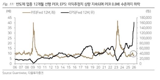 김 연구원은 “외국인의 지수 방향성 베팅의 변곡점은 삼성전자 잠정실적이 될 것”이라며 “실적 시즌으로 초점이 이동할 것을 감안해도 반도체 추정치 상향 강도는 단연 압도적”이라고 분석했다. 이어 “12월 말 대비 전일 코스피 12개월 선행 영업이익 추정치가 6.3% 상향됐고 연초 들어 반도체 이익 컨센서스 조정이 본격적으로 이뤄졌기 때문”이라고 설명했다.