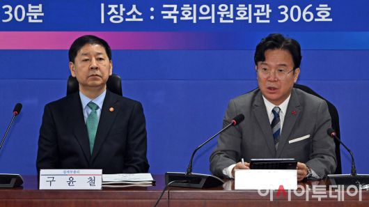 아시아투데이 송의주 기자 = 김영훈 고용노동부 장관이 7일 국회 의원회관에서 열린 2026년 경제성장전략 당정협의에서 발언을 하고 있다. 왼쪽은 구윤철 경제부총리 겸 기획재정부 장관. ⓒ "젊은 파워, 모바일 넘버원 아시아투데이"