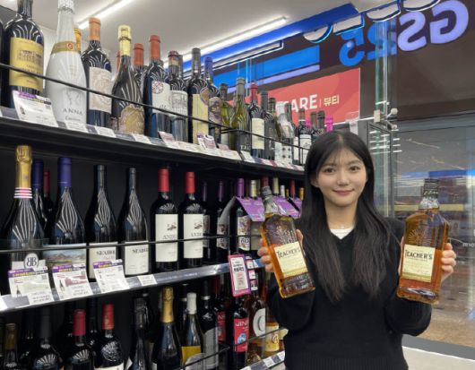 모델이 GS25에서 선보인 위스키 '티처스' 상품을 들고 있다. (사진=GS리테일) |