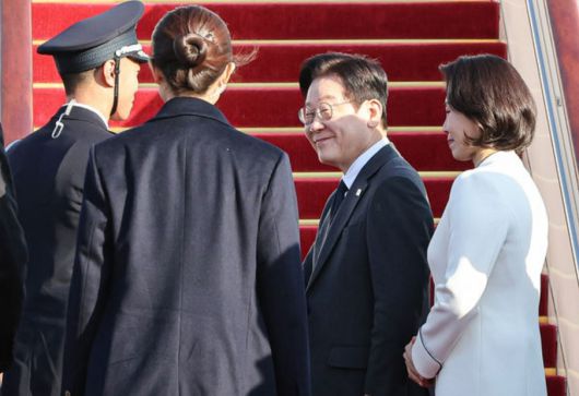 국빈 방문 베이징 일정을 마친 이재명 대통령과 김혜경 여사가 지난 6일 중국 서우두 국제공항에서 상하이로 향하며 환송 인사들과 인사하고 있다. 뉴시스 |