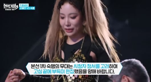 제작진은 자막을 통해 "승패가 있는 경연 프로그램의 특성상 결과에 대한 시청자의 이해를 돕기 위해 부득이하게 숙행의 무대를 분량 축소해 방송하게 됐다"며 양해를 구했다. 숙행의 무대 준비 과정에서도 동일한 취지의 안내 자막이 다시 한 번 등장해 눈길을 끌었다.